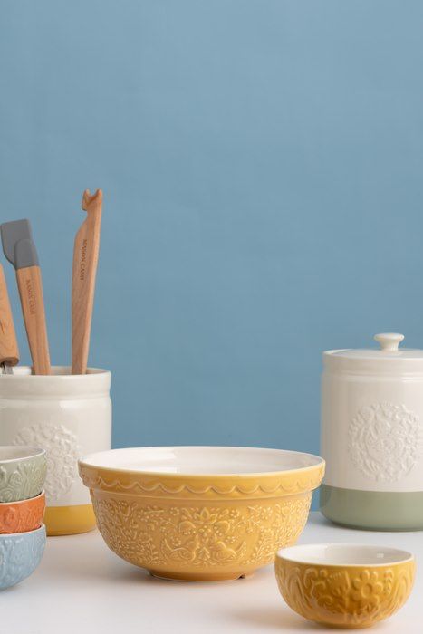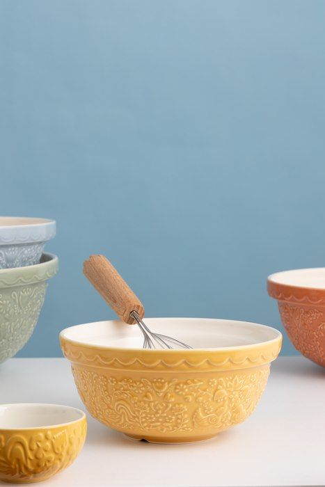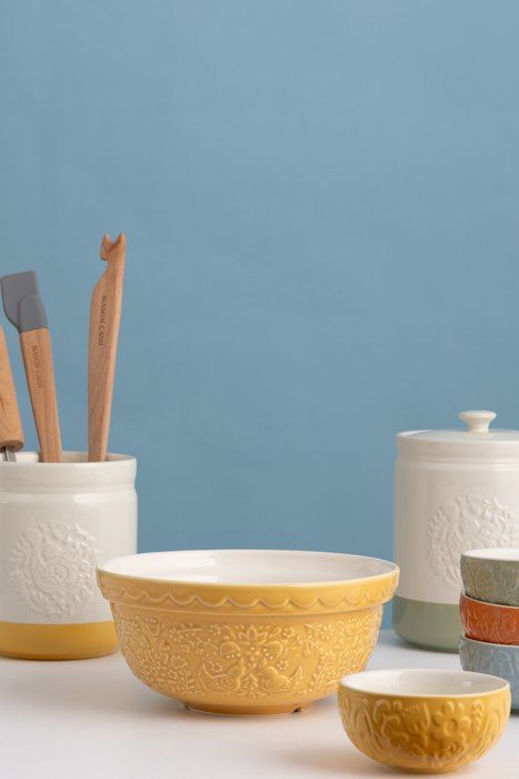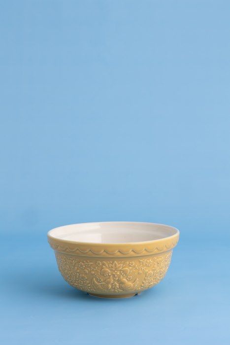 Чаша Home To Roost желтого цвета с декоративным тиснением, вдохновленным фольклорными мотивами (куры и петухи). Идеально подходит для приготовления небольших порций теста, печенья или выпечки. Плоская форма позволяет удобно замешивать тесто прямо в миске.